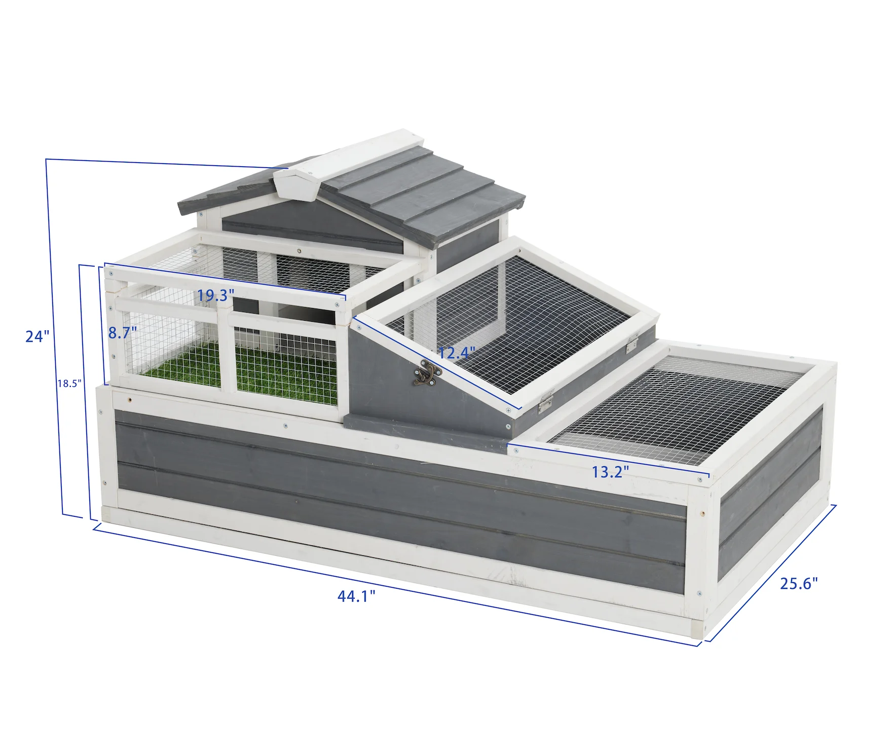 Maison à tortues 3 pièces en bois traité (112 × 65 × 59 cm), avec balcon en gazon synthétique, toit incliné et cloisons modulables. Convient aux tortues de toutes tailles. Usage intérieur ou extérieur. Livraison internationale en 5–10 jours ouvrés.
